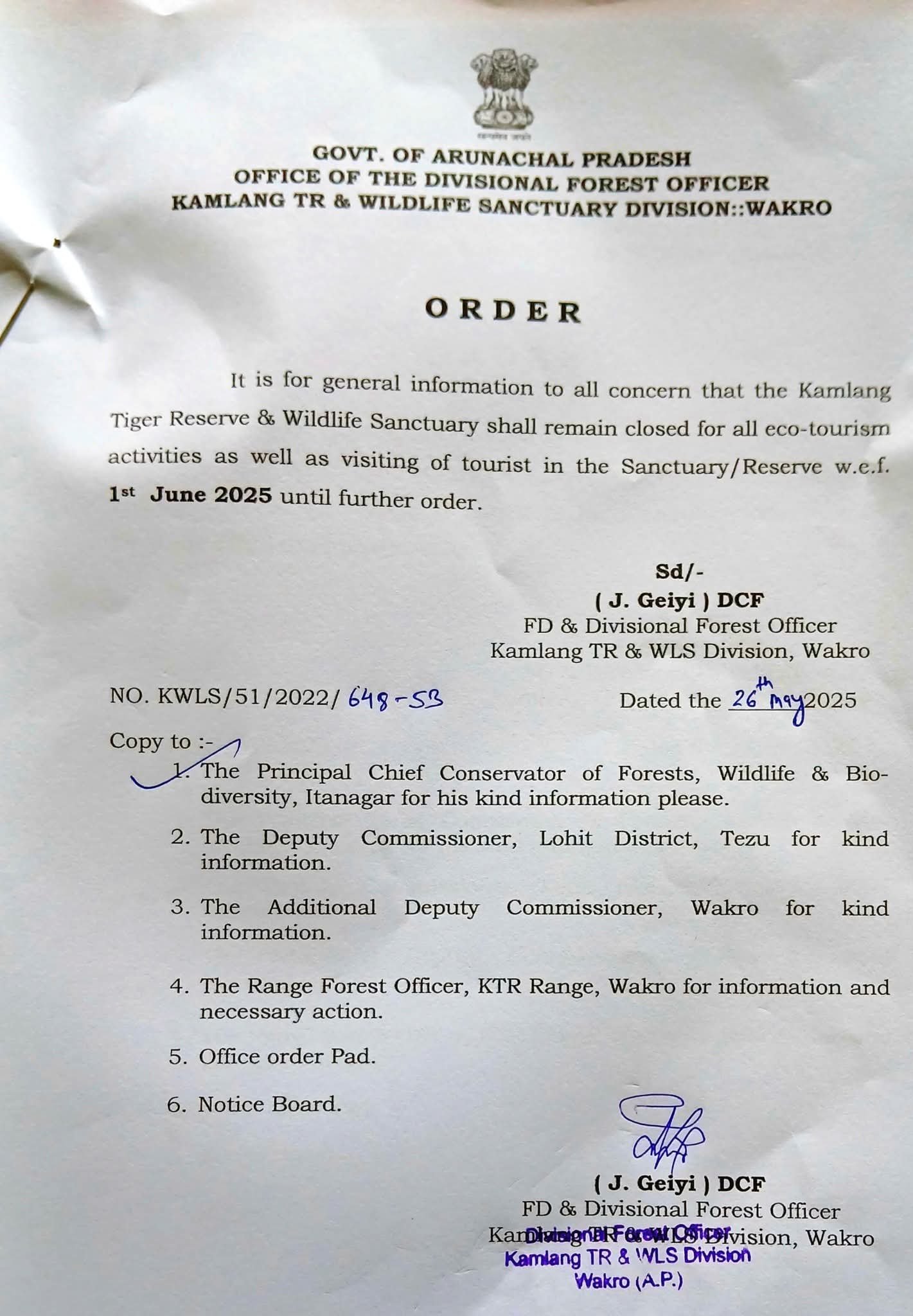 July 30, 2025, It is to inform all that Kamlang Tiger Reserve shall remain closed for all eco-tourism activities as well as visiting of tourist w.e.f from 1st July, 2025 until further order.
